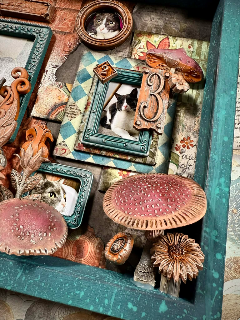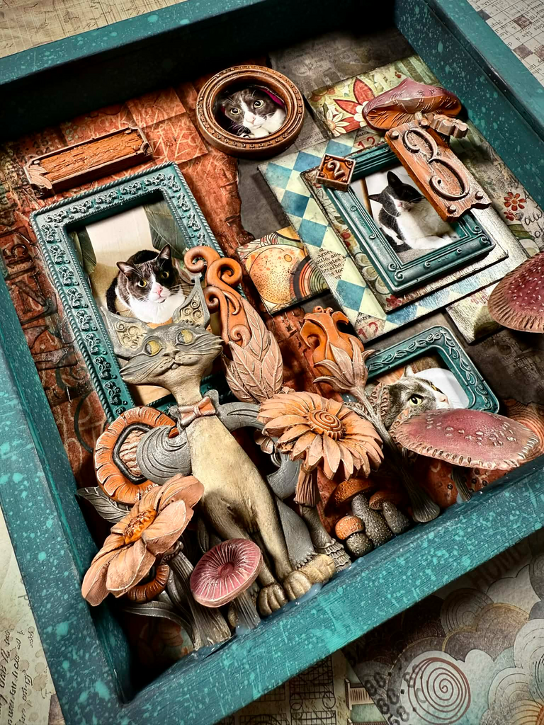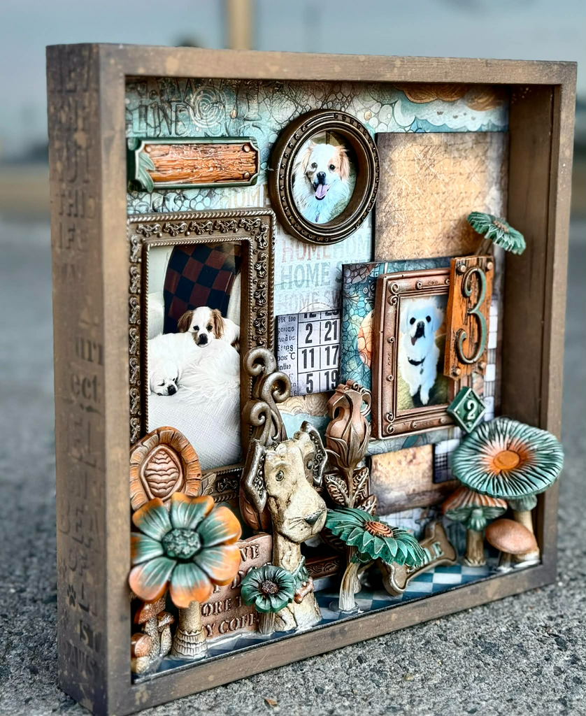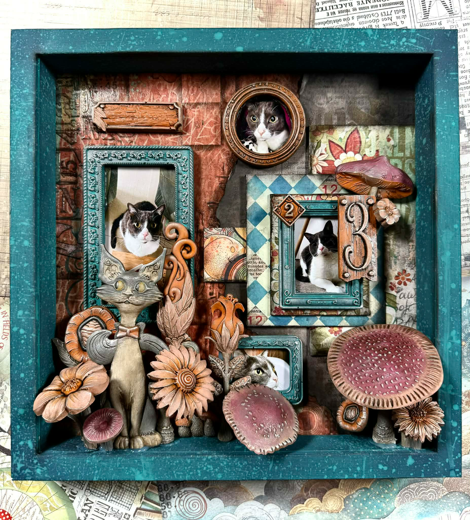 A dimensional shadow box filled with texture, warmth, and whimsy — customized to reflect your own cat or dog. Add your pet’s photo, name, and personality through layered embellishments and expressive techniques.