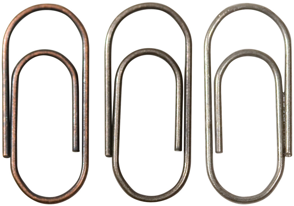 This package contains forty-eight 15x6mm paper clips in antique nickel, antique gold and antique copper finishes.
